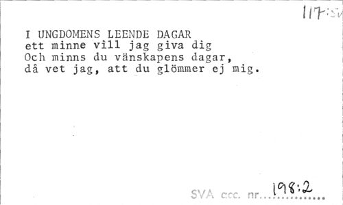 //// UT** //// I UNGDOMENS LEENDE DAGAR ett minne vill jag giva dig Och minns du vänskapens dagar, då vet jag, att du glömmer ej mig. //// SVA ccc, nr.. ////