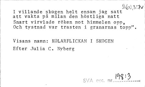 //// I villande skogen helt ensam jag satt att vakta på milan den höstliga natt Snart virvlade röken mot himmelen opp, Och tystnad var trasten i granarnas topp". //// Visans namn: KOLARFLICKAN I SKOGEN Efter Julia C. Nyberg //// SVA ccc. nr.. 11 . ////