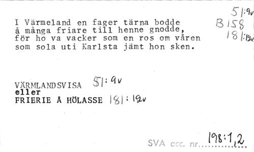 //// Sl-% //// I Värmeland en fager tärna bodde Q //// å många friare till henne gnodde, ' //// för ho va vacker som en ros om våren ' o l'l% som sola uti Karlsta jämt hon sken. //// VÄRMLANDSVISA 5*1 eller //// FRIERIE A HÖLASSE W //// SVA c: . nr.J^ll^. ////