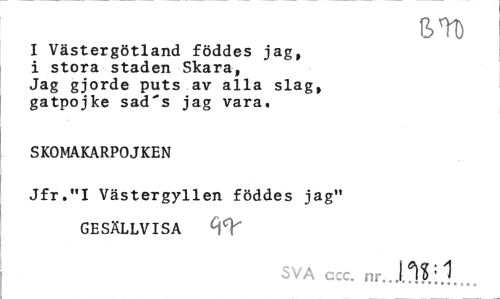 //// 6 ID //// I Västergötland föddes jag, i stora staden Skara, Jag gjorde puts av alla slag, gatpojke sad's jag vara, //// SKOMAKARPOJKEN //// Jfr."I Västergyllen föddes jag" GESÄLLVISA W //// SVA ccc. nr— ////