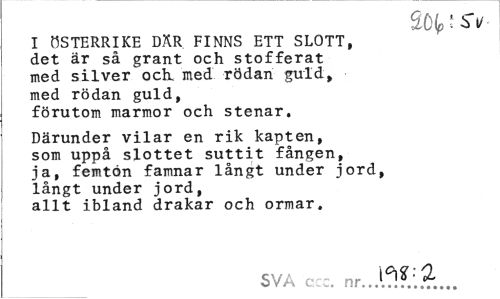 //// ! i/ //// I ÖSTERRIKE DÄR FINNS ETT SLOTT, det är så grant och stofferat med silver ock med rödan guld» med rödan guld, förutom marmor och stenar. //// Därunder vilar en rik kapten, som uppå slottet suttit fången, ja, femton famnar långt under jord, långt under jord, allt ibland drakar och ormar. //// sva c nr..A?!?.:.?:... ////