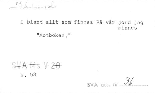 //// ci n //// - • >X* - <-v » t --- //// 1 bland allt som finnes På vår jord Jag //// minnes //// "Motboken." //// SVA-Ms V 28- //// s. 53 //// SVA ccc. nr. 31... ////