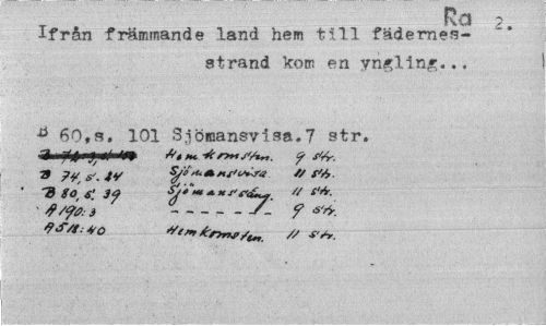 //// K<3 2 //// Ifrån främmande land hem till fädernes- //// strand kom en yngling... //// -0 60,b. 101 S.jömansvisa.7 str. //// anijtrf J), <09 f s'/r. //// TS py jy S^o ru a ttf>v*<r4 /y p/,. //// ' "B go s' 34 SjSm+MSf&y // f*. //// ---y_ f ////