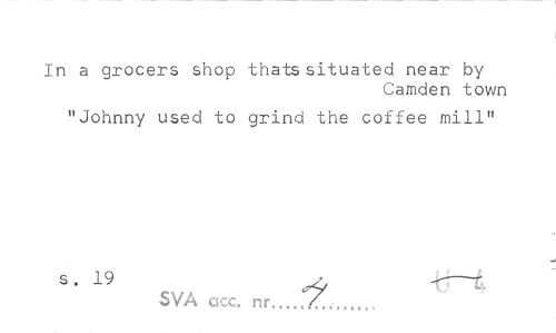 //// In a grocers shop thats situated near by //// Camden town //// "Johnny used to grind the coffee mill" //// s. 19 v, --- //// SVA cscc. nr.../..•... ////