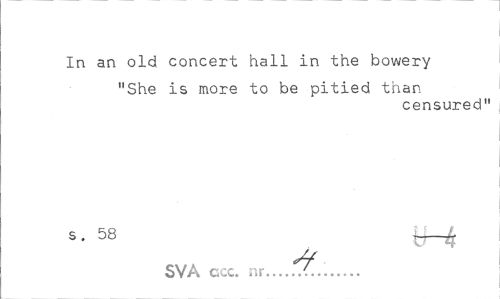 //// In an old concert hall in the bowery //// "She is more to be pitied than //// censured" //// 58 //// M //// SVA ccc. nr... ////