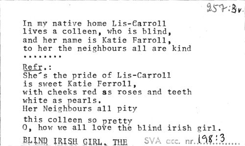 //// V //// In my native home Lis-Carroll lives a colleen, who is blind, and her name is Katie Farroll, to her the neighbours all are kind //// Refr.: //// She"s the pride of Lis-Carroll //// is sv/eet Katie Ferroll, //// with cheeks red ss roses and teeth //// white as pearls. //// Her Neighbours all pity //// this colleen so pretty //// 0, how we all love thé blind irish girl. BLIND IRISH GIRL. THF. SVA ccc. nr..LM:3... ////