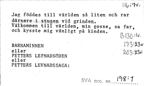 //// Ilfeiiv, //// Jag föddes till världen så liten och rar //// därnere i stugen vid grinden. //// Välkommen till världen, min gosse, sa far, //// och kysste mig vänligt på kinden. ^ //// BARNAMINNEN IT" V* v //// eller //// PETTERS LEFNADSÖDEN eller //// PETTERS LEVNADSSAGA: //// SVA ccc. nr...Q?i. ////