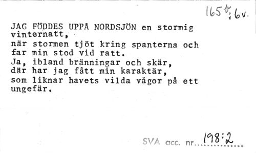//// its^u //// JAG FÖDDES UPPÄ NORDSJÖN en stormig vinternatt» //// när stormen tjöt kring spanterna och //// far min stod vid ratt. //// Ja, ibland bränningar och skär, //// där har jag fått min karaktär, //// som liknar havets vilda vågor på ett //// ungefär. //// SVA ccc. nr..]0! ////