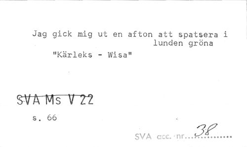 //// Jag gick mig ut en afton att spatsera i //// lunden gröna //// "Kärleks - Wisa" //// svrwrrr? //// s. 66 //// SVA ccc. nr...^... ////