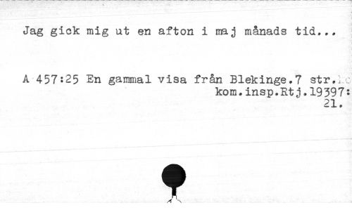 //// Jag gick mig ut en afton i maj månads tid... //// A 457:25 En gammal visa från Blekinge.7 str. //// kom.insp.Rtj.19397: //// 21. //// f ////