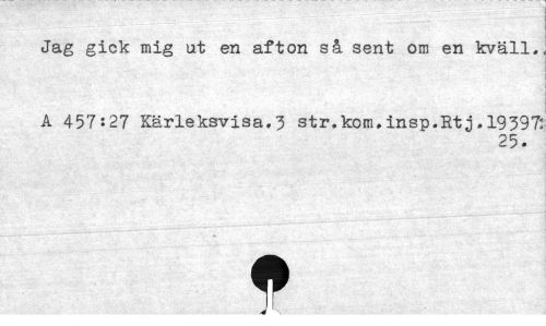 //// Jag gick mig ut en afton så sent om en kväll. //// A 457:27 Kärleksvisa. 3 str. kom, insp.Rtj. 19397: //// 25. //// t ////