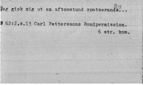 //// Jag giok mig ut en aftonstund spatserandé... //// 3 62:2fs.l3 Carl Petterssons Bondpermission. //// 6 str. kom. ////