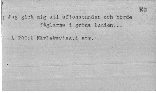//// I //// Ro //// | Jag gick mig uti aftonstunden och hörde faglarna i gröna lunden... //// A 200:6 Karleksvisa*4, str. ////