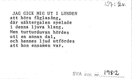 //// JAG GICK MIG UT I LUNDEN att höra fåglasång, där näktergalen spelade i denna ljuva klang. Men turturduvan hördes uti en annan dal, och hennes ljud utfördes att hon ensamen var. //// SVA crcc nr.. ////