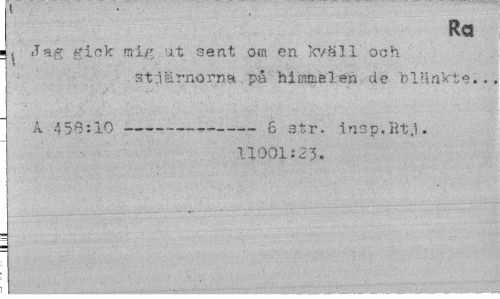 //// Ra //// 11 Jag gick m-ig ut sent om en kväll' och //// stjärnorna på Misste len de blänkte.., //// A 456:10 --- 6 str. insp.Ht.1. //// 11001s 23. ////