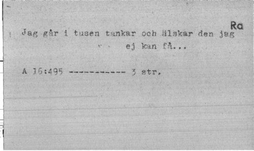 //// Ro //// Jag gar i tusen tankar och älskar den jag //// • ej kan få. .. //// A ]6:495---3 str. ////