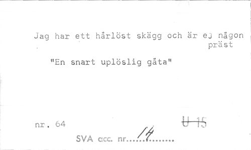 //// Jag har ett hårlöst skägg och är ej någon //// präst //// "En snart uplöslig gåta" //// nr. 64 "tH5 SVA ccc. nr.../T... ////