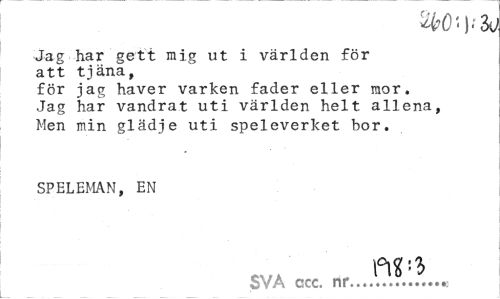 //// Jag har gett mig ut i världen för att tjäna, //// för jag haver varken fader eller mor. Jag har vandrat uti världen helt allena, Men min glädje uti speleverket bor. //// SPELEMAN, EN //// SVA ccc. nr...« ////