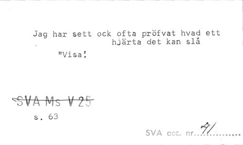 //// Jag har sett ock ofta pröfvat hvad ett //// hjärta det kan slå //// "Visa'. //// s. 63 //// SVA ccc. nr../r... ////