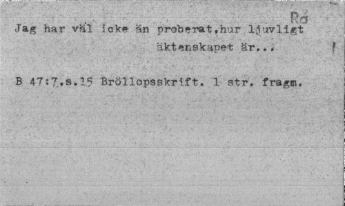 //// - ~ //// P>4 //// jag har väl icke än proberatfhur ljuvligt //// äktenskapet är... //// B 47:7,s.l5 Bröllopsskrift. 1 str, fragm. ////