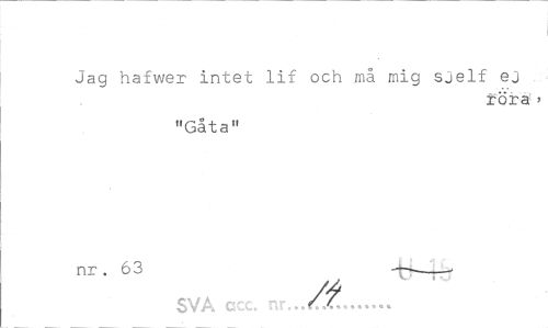 //// Jag hafwer intet lif och må mig sjelf ej //// föra5 > //// "Gåta" //// nr . 63 //// SVA acc, nr. /t... ////