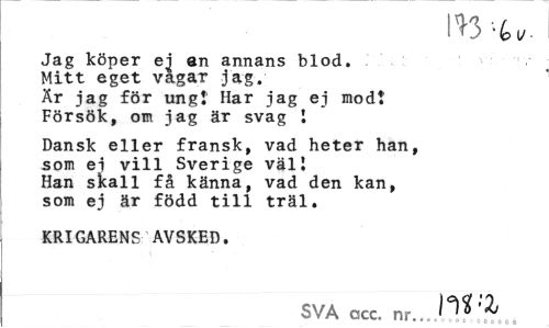 //// 1*3 -U //// Jag köper ei an annans blod. Mitt eget vagar jag. Är jag för ungt Har jag ej mod! Försök, om jag är svag I //// Dansk eller fransk, vad heter han, som ej vill Sverige väl! Han skall få känna, vad den kan, som ej är född till träl. //// KRIGARENS AVSKED. //// SVA ccc. nr...v... ////