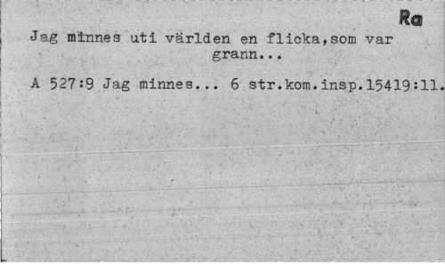 //// Ro //// Jag minnes uti världen en flicka,som var //// grann... //// A 527:9 Jag minnes... 6 str.kom.insp.15419:11 ////