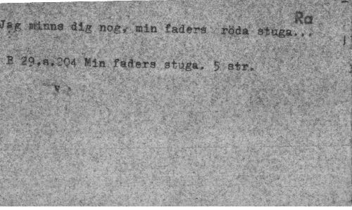 //// Ra //// minna dig nog,- min faders röda stuga... //// B 29,S,204 Min faders stuga, 5 atr, //// s> s »i* ml fH^v^JmMm i ' • • • ' - //// ¦'V-'. t.J ¦ : - : " - ¦ ¦ * ' - . ¦ //// •¦¦¦¦; ">v. ::.' ..,: . >>' V* V"'^"*' >. '• ^'-v ¦ " i //// " ' .- v: 4 £ ¦ - W- \ ..>•>'..v>v , ¦•- - //// "c ¦¦'V ¦•¦V-r. , :,•... -.-.. . . i . ¦¦ ';¦, . , j: . - ¦-: //// •v' ¦ > ¦ " > r • :*K : "jte* y -.r' . . //// -^v." ; v. -i ////