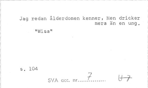 //// Jag redan ålderdomen kenner, Men dricker //// mera än en ung. //// "Wisa" s. 104 //// SVA acc. nr.. ...t... tH- ////