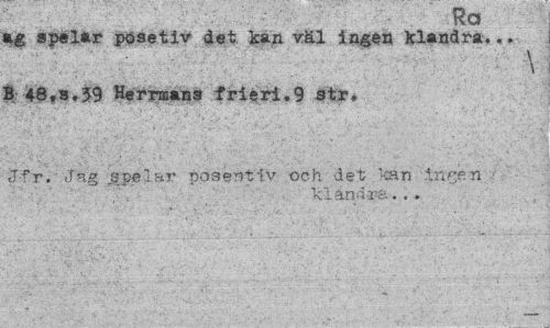 //// Ra //// ag spelar pösetiv det kan väl ingen klandra... //// \ //// B 48 //// ?s» 39 Herrmans frieri.9 str» //// Jfr. Jag spelar posentiv och det kan Ingen . //// . > ¦ , klandra... ////