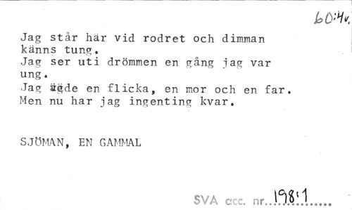 //// Jag står har vid rodret och dimman känns tung. //// Jag ser uti drömmen en gång jag var ung. //// Jag ägde en flicka, en mor och en far. Men nu har jag ingenting kvar. //// SJÖMAN, EN GAMMAL //// SVA ccc. nr...-- — — - ////