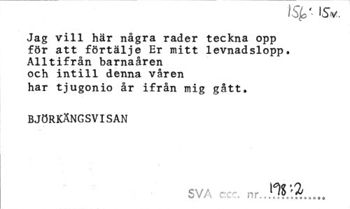 //// isy IS,v. //// Jag vill här några rader teckna opp för att förtälje Er mitt levnadslopp. Alltifrån barnaåren och intill denna våren har tjugonio år ifrån mig gått. //// BJÖRKÄNGSVISAN //// SVA c:cc. nr...!??/.?' ////