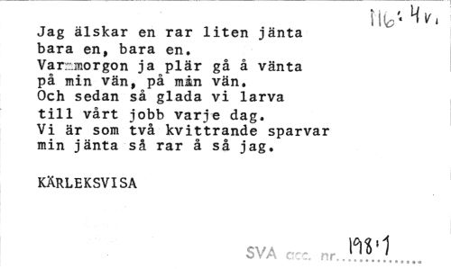//// tv- //// Jag älskar en rar liten jänta bara en, bara en. Varrmorgon ja plär gå å vänta på min vän, på min vän. Och sedan så glada vi larva till vårt jobb varje dag. Vi är som två kvittrande sparvar min jänta så rar å så jag. //// KÄRLEKSVISA //// SVA c : nr-.^.?.'.!... ////