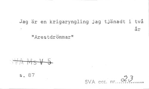 //// Jag är en krigaryngling Jag tjänadt i två //// o //// ar //// "Arestdrömmar" //// s. 87 - //// SVA ccc. nr...f~.V?... ////