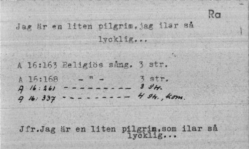 //// Ra //// Jag är *n liten pilgrins, jag ilar så //// lycklig. //// A 16:163 Beligiös sång. 3 str. A 16:168 - " - 3 str. //// $ /t: % b)---3 S/y. //// 9 /*.• 3dy ---^ , //// Jfr.Jag är en liten pilgrim,som ilar så //// lycklig... ////