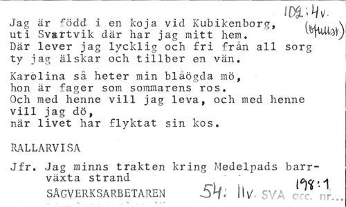 //// ww- //// Jag är född i en koja vid Kubikenborg, A //// uti Svartvik där har jag mitt hem. vbyiUi}^ //// Där lever jag lycklig och fri frän all sorg ty jag älskar och tillber en vän. //// Karolina så heter min blaögda mö, //// hon är fager som sommarens ros. //// Och med henne vill jag leva, och med henne //// vill jag dö, //// när livet har flyktat sin kos. RALLARVISA //// Jfr. Jag minns trakten kring Medelpads barrväxta strand 1 //// SÅGVERKSARBETAREN S^fl \\V SV/ r ~ nr... ////