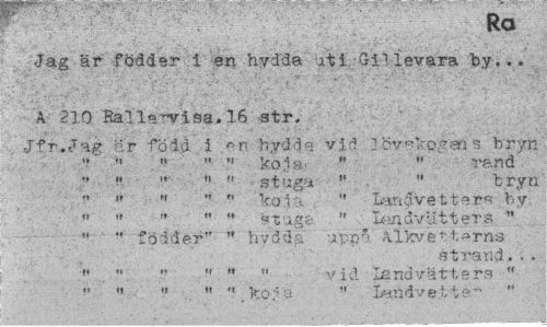 //// O //// Ra //// Jag är födder i en hydda uti Gli levara by. .. //// A 210 Balla^visa.16 atr. ' //// , .Jfr. Jag- är född i en hydda vid 2 cv-sko.^sri s bryn //// ... ko,la. " " rand //// " " " " stuga " " bryn //// " " " " " kola " Landvetters b v //// " ... «tug& " . Landvlitters " //// " födder" " hydda uppa Alkvett^rns //// strand... //// V... " " vid land vätt ers " //// " " " " ". koja " iMudve.tte- " ////