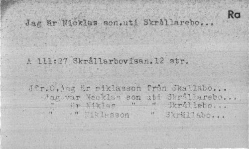 //// F ¦ //// Ra //// Jag är K lo kläs son,utI Skrållarebo,., //// A 111:27 Skrållarbovlsan.12 str. //// J-"r.G,V g ;ir rrlklassoh' f r<*n Skållat» o,. . ¦-laF-v-är Veckig son uti 3kr°llarebo. . . //// vr FiklR? " " -Ikrållebo. , . //// " ::iklt> s s on " 3kräi 7 ;. . . ////