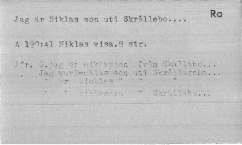 //// Ro //// Jag är Niklas son uti Skrållebo... //// A 190:41 Niklas visa.8 str. //// i r Lk...n fr °n i ••. i" Lahc. . . //// J a;' V •; r: i" ', 1 -- •:-n a t i ¦ r " ; : I. o . . . //// " ' r MoV-U-s " ////