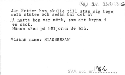 //// \%v. yjbvws //// Jan Petter han skulle till stan sig bege sela stuten och sedan bar det av //// . Å natta hon var mörk, som att krypa i en säck. //// Månen sken på böljorna de blå. Visans namn: STADSRESAN //// SVA ccc. nrJjlvk... ////