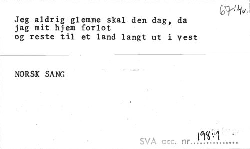 //// Jeg aldrig glemme skal den dag, da //// jag mit hjem forlot //// og reste til et land långt ut i vest //// NORSK SANG //// SVA ccc. ... ////