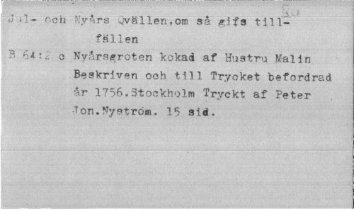 //// .i - •' //// Jil- f.oh Nyårs Qvällen.om så gifs tillfallen //// B bil:, c Nvårsgroten kokad af Hustru Malin //// Beskriven ooh till Trycket befordrad år 1756.Stockholm Tryckt af Peter •Ton.Nyström. 15 sid. ////