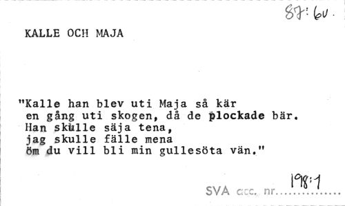 //// m- y ¦ //// KALLE OCH MAJA //// "Kalle han blev uti Maja så kär en gång uti skogen, då de plockade bär. Han sk&lle säja tena, jag skulle fälle mena öm du vill bli min gullesöta vän." //// \°\V1 //// SVA ccc. nr. ... ////
