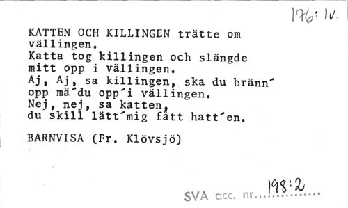 //// 1%' II/ //// KATTEN OCH KILLINGEN trätte om vällingen. //// Katta tog killingen och slängde //// mitt opp i vällingen. //// Aj, Aj , sa killingen, ska du bränn' //// opp mä^du opp'i vällingen. //// Nej, nej, sa kattenf //// du skill lätt^mig fatt hatt^en. //// BARNVISA (Fr. Klövsjö) //// SVA ccc. nr...!... ////