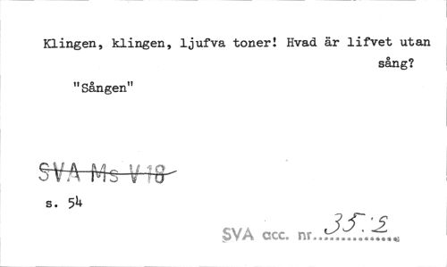 //// Klingen, klingen, ljufva toner! Hvad är lifvet utan //// sång? //// "Sången" s. 5U //// SVA ccc. ////