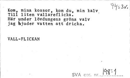 //// Kom, mina kossor, kom du, min kalv Till liten vallareflicka. Här under lövdungens gröna valv jag hjuder vatten att dricka. //// VALL-FLICKAN //// t //// SVA ccc. nr..A .*...'... ////