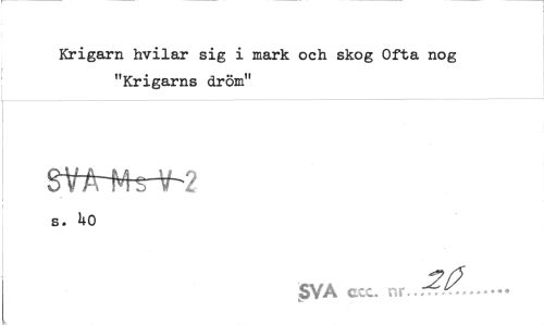 //// Krigarn hvilar sig i mark och skog Ofta nog "Krigarns dröm" //// StA-Nh-V- 2 //// s. bO //// SVA ccc. ... ////