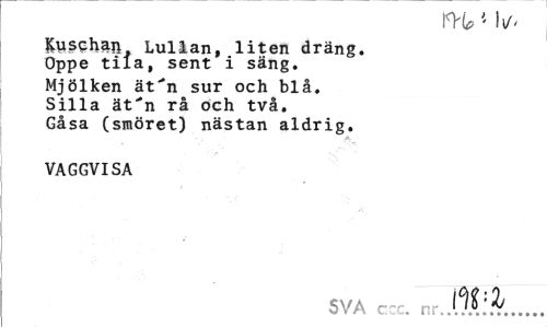 //// duschan Lullan, liten dräng. Oppe tila, sent i säng. //// Mjölken ät'n sur och blå. Silla ät'n rå och två. Gåsa (smöret) nästan aldrig. //// VAGGVISA //// SVA ccc. nr.JS:.^... ////