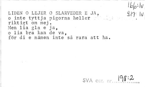 //// Ib^li/ //// LIDEN O LEJER O SLARVEDER E JA, f //// o inte tyttja pigorna heller //// riktigt om mej. //// Men lia gla e ja, //// o lia bra kan de va, //// för di e nämen inte så rara att ha. //// sva c. W:^... ////