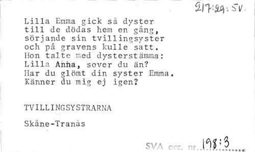 //// Lilla Emma gick så dyster till de dödas hem en gång, sörjande sin tvillingsyster och på gravens kulle satt. Hon talte med dysterstämma: Lilla Anha, sover du än? Har du glömt din syster Emma. Känner du mig ej igen? //// TVILLINGSYSTRARNA Skåne-Tranas //// SVA ccc. nr. //// ws ////